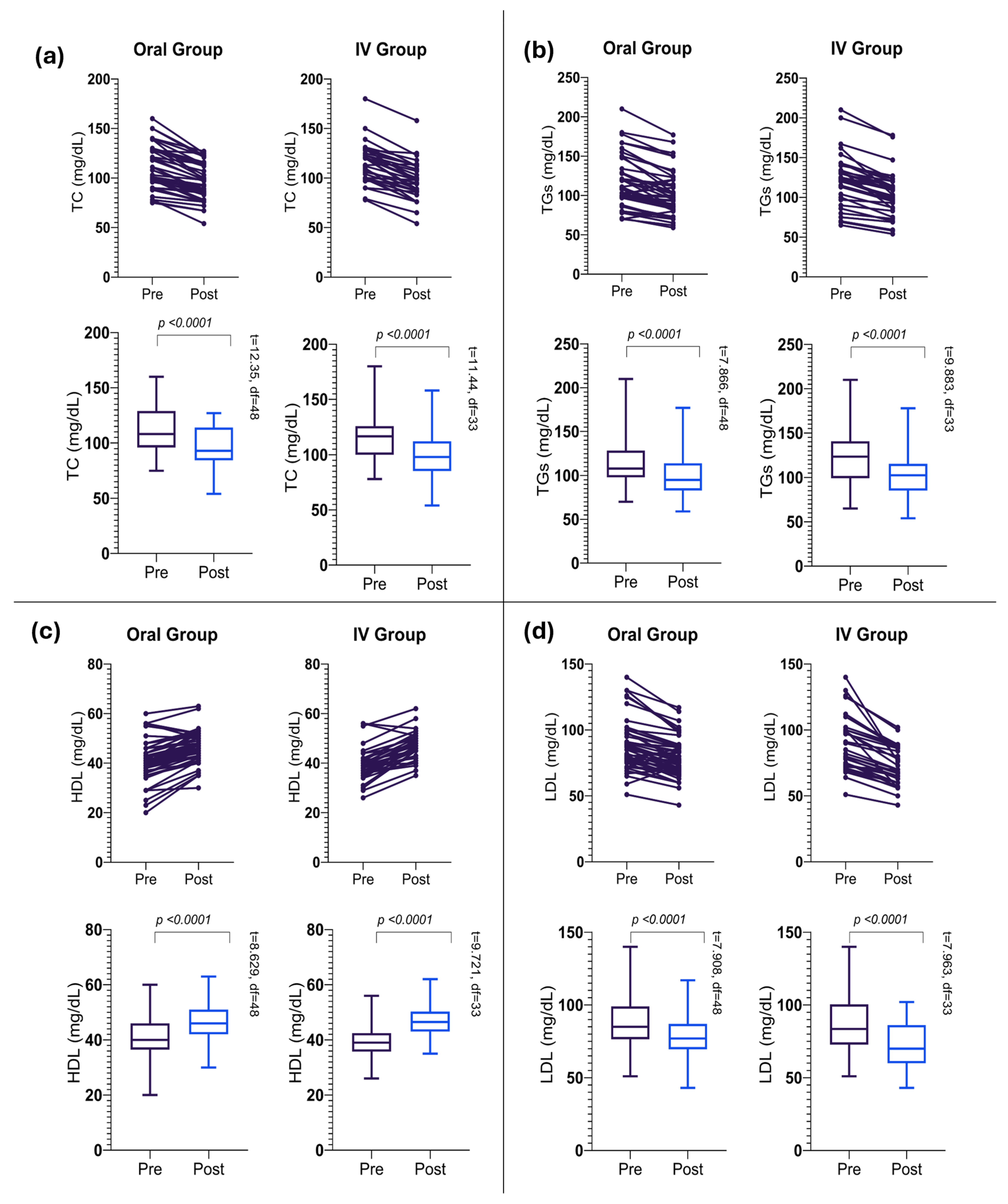 Figure 4. Comparative effects of oral versus intravenous therapy on lipid profile. (a) Changes in total cholesterol (TC), (b) triglycerides (TGs), (c) high-density lipoprotein (HDL), and (d) low-density lipoprotein (LDL).