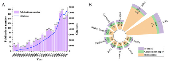 (A) The annual publication and citation growth of the literature regarding the application of organic nanoparticles for AS treatment. (B) The most contributing countries in the application of organic nanoparticles for AS treatment.