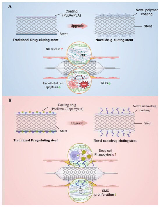 Novel drug-eluting stents designed for the treatment of atherosclerosis. (A) The novel polymer-coated scaffold has antioxidant and nitric oxide release functions, replacing the traditional PLGA/PLA coating. (B) The novel scaffold with nano-drug coating can enhance the clearance of apoptotic cells and inhibit the proliferation of smooth muscle cells, replacing the traditional drug-coated scaffolds containing paclitaxel and rapamycin. The red arrow represents enhancement, and the green arrow represents inhibition.