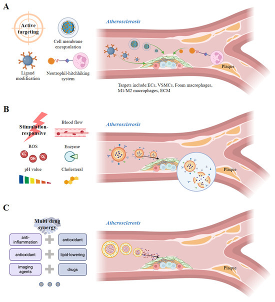Design of traditional organic nanocarriers for the treatment of atherosclerosis. (A) Targeted nanocarriers for the treatment of atherosclerosis, including ligand modification, cell membrane encapsulation, and neutrophil hijacking. The targets include ECs, VSMCs, Foam macrophages, M1/M2 macrophages, ECM, etc. (B) Intelligent responsive nanocarriers for the treatment of atherosclerosis. The stimulation methods include ROS, pH, blood flow, enzymes, and cholesterol. (C) Multi-drug co-loaded nanocarriers for the treatment of atherosclerosis. The red and blue triangles represent different drugs.