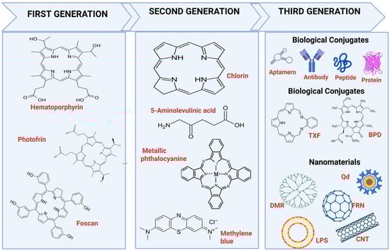 The first generation of PSs includes hematoporphyrin, photofrin (II) porphyrins, and their derivatives (Fotosan, Fotocan, and Fotofrin), (Figure 2). Despite their demonstrable efficacy, there are inherent limitations with regard to selectivity, and significant side effects on healthy tissue [].