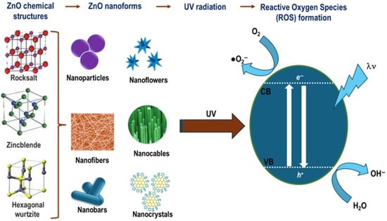 Main crystalline structures of ZnO, nanoforms of the zinc oxide and ROS formation by irradiation of ZnO with UV light. VB, valence band; CB, conductance band.