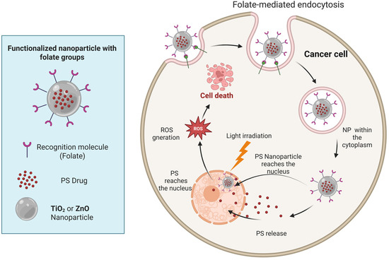 ZnO-based nanomaterials have also been investigated as PSs in PDT due to their high surface-to-volume ratio [,,,]. ZnO nanoparticles have been shown to have a photosensitizing effect on hepatocellular carcinoma cells (HepG2) []. In addition, ZnO nanostructures are used for drug delivery and diagnostic purposes.