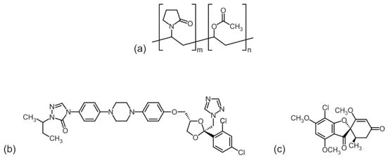 Molecular structure of copovidone (a) and the drugs itraconazole (b) and griseofulvin (c).
