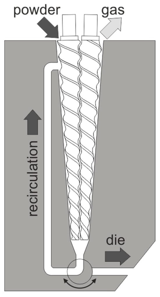The production scale extrusion experiments were carried out in a co-rotating twin screw extruder (ZSE 27 MAXX, Leistritz, Nuremberg, Germany) with a 28.3 mm diameter and a length of 40 D. A heated extrusion die with a 3 mm diameter and 11.7 mm length was chosen. The powder material was metered by a loss-in-weight feeder (K-Tron K-ML-SFS-KT20, Coperion, Niederlenz, Switzerland) into the extruder feeding port.
