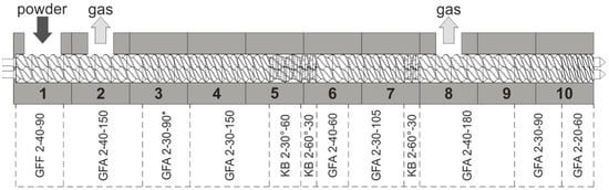- Kohlgrüber, K.; Bierdel, M. Co-Rotating Twin-Screw Extruders: Fundamentals, Technology, and Applications; Carl Hanser Publishers: Munich, Germany; Hanser Gardner Publications: Cincinnati, OH, USA, 2008; Volume xiii, p. 354. [Google Scholar]