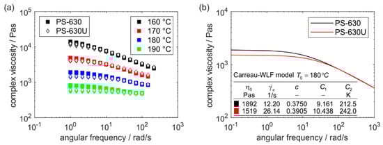 Viscosity curves (n = 3) from oscillatory rheometry of PS-630 and PS-630U (a) and Carreau-WLF model at a reference temperature of 180 °C according to the time-temperature superposition (b).