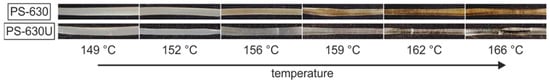 Depending on the melt temperature and residence time, the extrudates show a transition from opaque to transparent appearance, as exemplarily depicted for the GRI formulation with 15 wt% drug in Figure 6. At lower melt temperatures, the extrudates were opaque, signifying the presence of undissolved drug crystals. Above a specific temperature threshold, the appearance shifted from opaque to transparent for all formulations, indicating that the temperature for the respective residence time was sufficient to completely dissolve the drug in the polymer. The visual comparison of the extrudates from PS-630 and PS-630U already suggests that the complete dissolution of the drug is achieved at similar temperatures, as the transition from opaque to transparent appears comparable. However, a stronger yellowing is noticeable for PS-630 compared to PS-630U at higher temperatures. In order to prove this first visual impression, UV-Vis spectroscopic data is evaluated in the following to quantify the ASD formation (Section 3.2) as well as the yellowing (Section 3.3).