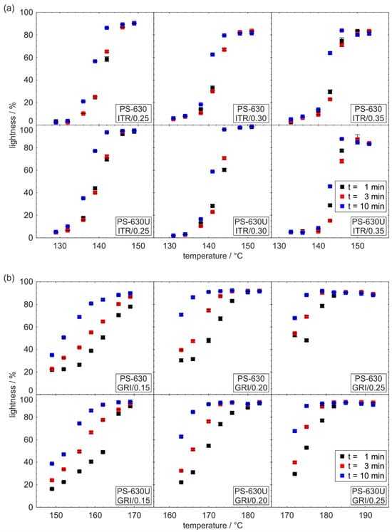 Figure 7 illustrates the relationship between the lightness and extrusion temperature as well as residence time for formulations containing itraconazole (a) and griseofulvin (b). All formulations exhibit a characteristic sigmoidal course, where lightness starts at lower values and increases with temperature until reaching a maximum. This trend is due to the decreasing presence of undissolved drug particles, which scatter light. As a result, the plateau at maximum lightness indicates complete dissolution of the drug in the polymer.