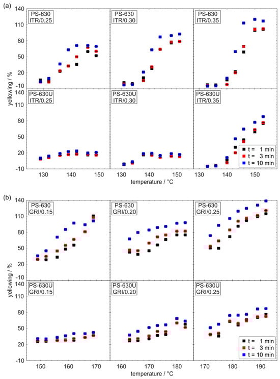 In general, the yellowing increases with temperature and residence time. However, large differences in yellowing were observed when comparing both copovidone grades. For the PS-630 formulations, the yellowing is larger than for the PS-630U formulations. Furthermore, the yellowing increases more significantly with the processing temperature for the PS-630 formulations. For a specific formulation, the yellowing between the residence times from 1 to 10 min differs more strongly for the PS-630 formulations. This is explained by the kinetics of degradation processes that follow a certain degradation rate.