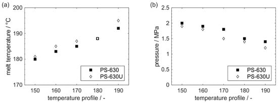 When comparing the material temperatures of both copovidone grades, a slightly higher temperature of PS-630U is noticeable at the various temperature profiles. These differences in shear heating are attributed to the individual melt rheology of the polymers and the duration of shearing in the extruder (residence time) [20]. According to the slightly higher material temperatures and lower viscosities of PS-630U, slightly lower pressures were observed at the die (Figure 9b).
