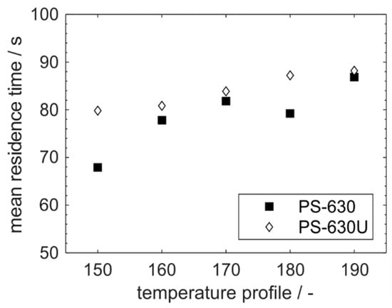 PS-630U exhibited slightly higher mean residence times than PS-630 (Figure 11). In general, higher mean residence times were observed for lower viscosities, namely for higher temperatures as well as for PS-630U when comparing both copovidone grades. The mean residence time can be correlated with the degree of filling in the extruder by considering that the hydrodynamic residence time in completely filled sections does not change for a constant mass flow. Consequently, the degree of filling increases with decreasing viscosities.
