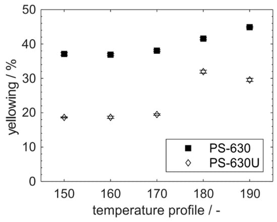 Yellowing of PS-630 and PS-630U during production scale extrusion (n = 10).