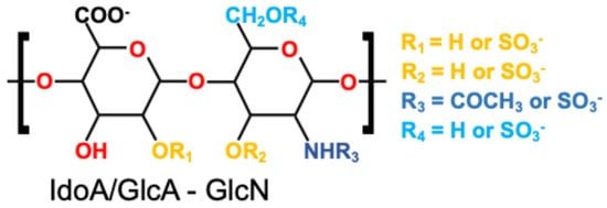 Heparin is a linear, unbranched polysaccharide composed of repeating disaccharide units, each consisting of a hexuronic acid—either L-iduronic acid (IdoA) or D-glucuronic acid (GlcA), which are C-5 epimers—and D-glucosamine (GlcN). Figure 1 illustrates a generalized disaccharide unit of heparin, highlighting key modifiable positions. Functional substitutions may occur at the 2-O-position and 6-O-position of the sugar residues (R1 and R2), the C2 amino group of glucosamine (R3), and the C6 hydroxyl (R4), allowing for variable patterns of O- and N-sulfation or N-acetylation. This structural flexibility underlies heparin’s chemical heterogeneity and its capacity to interact with diverse biological targets. These structural modifications give rise to a highly anionic polysaccharide with substantial chemical heterogeneity. These anionic groups are primarily responsible for electrostatic interactions with cationic proteins and also participate in ionic crosslinking with multivalent ions or polycations in material systems. The polymer backbone contains several chemically active groups, each enabling specific modification strategies as summarized in Table 1.