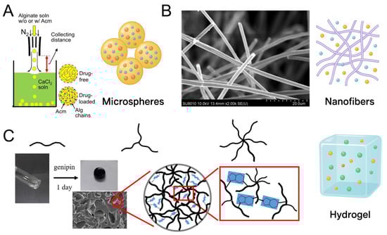 Representative designs of heparin-based drug delivery platforms. (A) Schematic and illustration of alginate microspheres formed by ionic gelation. Adapted with permission from [86]. Copyright (2021) Elsevier. (B) SEM image and schematic representation of electrospun nanofibers. Adapted from [87]; licensed under CC BY 4.0. (C) Crosslinked hydrogel network with embedded drug molecules and porous microstructure. Adapted with permission from [88]. Copyright (2020) Elsevier.