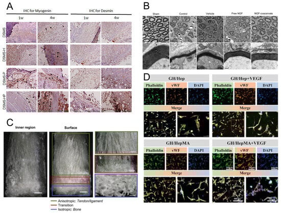 - Zhang, J.; Liu, X.; Ma, K.; Chen, M.; Xu, H.; Niu, X.; Gu, H.; Wang, R.; Chen, X.; Sun, H. Collagen/heparin scaffold combined with vascular endothelial growth factor promotes the repair of neurological function in rats with traumatic brain injury. Biomater. Sci. 2021, 9, 745–764. [Google Scholar] [CrossRef]
