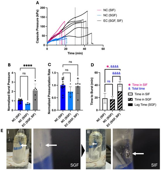 The effect of enteric-covered delivery orifice on bursting behavior of OSPRAE capsules in SGF and/or SIF. (A) Capsule pressure is shown as a function of time for non-covered capsules placed in SIF (NC (SIF)) or SGF (NC (SGF)) or enteric-covered capsules placed in SGF for 30 min and then immediately transferred to SIF (EC (SGF, SIF)). The dotted line indicates 30 min, when the EC capsules were transferred from SGF to SIF. (B–D) Capsule burst pressure, pressurization rate, and time to burst were calculated from the data in part (A). Data were normalized to NC capsules in SIF. One-way ANOVA was used to determine significance (ns: p > 0.05, &&&& or **** p < 0.0001, n = 5–14 replicates per group). Welch’s t-test was also used in part (D) to determine significance (* p < 0.05, n = 6–14 replicates per group). Statistical significance is shown for comparisons of time to burst just while in SIF (*) and total time until burst (&). (E) Representative images (shown at low and high magnification) of EC capsules in SGF (i) and after transferring from SGF to SIF (ii). Arrows indicate the delivery orifice. Capsules contained dried CA and SB, and were coated with 13 mg enteric covering per capsule.