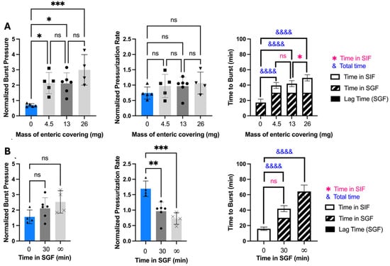 The effect of enteric covering thickness and SGF incubation time on bursting behavior of OSPRAE capsules. Capsule burst pressure, pressurization rate, and time to burst are shown as a function of (A) mass of enteric covering per capsule after being incubated in SGF for 30 min and then transferred to SIF or (B) incubation time in SGF before transfer to SIF: 0 min (SIF only), 30 min (SGF then SIF), or infinite time (only SGF). In part (B), capsules that burst at locations other than the delivery orifice are represented by X symbol data points. Data were normalized to non-covered capsules. Capsules contained CA and SB, and were coated with 13 mg enteric covering per capsule in part (B). One-way ANOVA in parts (A,B) or Welch’s t-test in part (B) (ns: p > 0.05, * p < 0.05, ** p < 0.01, *** p < 0.001, &&&& p < 0.0001) were used to determine significance (n = 4–6 replicates per group). Statistical significance is shown for comparisons of time to burst just while in SIF (*) and total time until burst (&).