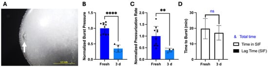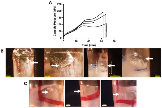 Using this approach, CA was pre-dried, resulting in a loss of 7.50 ± 0.71% w/w water (n = 6). After mixing the dried CA with SB (having a water content of 3.32 ± 0.44% w/w water (n = 4), fresh capsules tested in vitro for bursting behavior in SIF (Figure 6A) showed significantly lower burst pressure (Welch’s t-test, p < 0.0001), lower pressurization rate (Welch’s t-test, p < 0.0001), longer time to burst (Welch’s t-test, p = 0.0001), and no lag time before bursting.