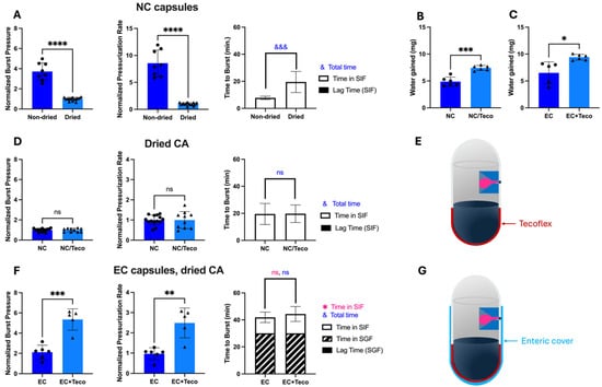 As expected, replacing lacquer with Tecoflex enabled capsules to gain more water when placed in SIF or SGF (Figure 6B,C, Supplementary Figure S5A(iii,iv),B(iii,iv)). The Tecoflex coating was only applied to the bottom of the capsule body, adjacent to the excipients, and lacquer was applied to the rest of the capsule body and top. Tecoflex-based capsules with dried CA did not show improvement compared to lacquer-based capsulate, exhibiting similar burst pressure (Welch’s t-test, p > 0.05) and pressurization rate (Welch’s t-test, p > 0.05) (Figure 6D,E). However, when evaluating enteric-covered capsules with dried CA (which is our main interest for drug delivery), Tecoflex allowed for significantly higher burst pressure (Welch’s t-test, p < 0.001) and pressurization rate (Welch’s t-test, p < 0.01) than without Tecoflex, so this design was further pursued (Figure 6F,G). The final composition (w/w) of the empty capsule shell (body and cap) for the design shown in Figure 6G was 75% gelatin, 16% lacquer, 2% Tecoflex, and 7% enteric coating.