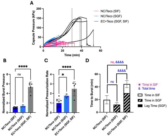 The effect of enteric covering on bursting behavior of OSPRAE capsules with Tecoflex in SGF and/or SIF. (A) Capsule pressure is shown as a function of time for non-covered capsules placed in SIF (NC/Teco (SIF)) or SGF (NC/Teco (SGF)) or enteric-covered capsules placed in SGF for 30 min and then immediately transferred to SIF (EC/Teco (SGF, SIF)). The dotted line indicates 30 min, when the EC/Teco capsules were transferred from SGF to SIF. (B–D) Capsule burst pressure, pressurization rate, and time to burst were calculated from the data in part (A). Data were normalized to NC/Teco capsules in SIF. Statistical significance is shown for comparisons of time to burst just while in SIF (*) and total time until burst (&). One-way ANOVA was used to determine significance (ns: p > 0.05, * p < 0.05, &&&& or **** p < 0.0001, n = 4–10 replicates per group). Welch’s t-test in part (D) was also used to determine significance (ns: p > 0.05, n = 5–9 replicates per group). Capsules contained dried CA and SB and 13 mg enteric covering per capsule (for EC and EC/Teco).