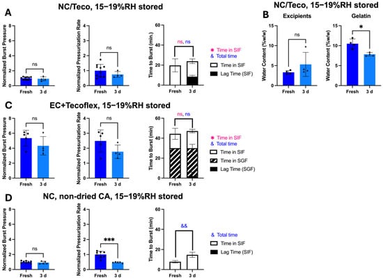 The effect of storage for 3 days at reduced humidity on bursting behavior of OSPRAE capsules in SIF. (A) Non-covered OSPRAE capsules containing Tecoflex (NC/Teco) were tested in SIF after storage. Capsules contained dried CA and SB, but no enteric covering. Data were normalized to NC/Teco capsules in SIF. (B) Water content was measured in excipients and gelatin capsule walls from NC/Teco capsules by Karl Fischer titration. (C) Enteric-covered OSPRAE capsules containing Tecoflex (EC/Teco) were tested after storage by incubating in SGF for 30 min and then transferring to SIF. Capsules contained dried CA and SB, and 13 mg enteric covering per capsule. Data were normalized to NC/Teco capsules in SIF. (D) Non-covered OSPRAE capsules (NC) were tested in SIF after storage. Capsules contained non-dried CA and SB, but no enteric covering. Data were normalized to NC capsules in SIF. Capsules were stored at 15–19% RH at room temperature and pressure. Statistical significance is shown for comparisons of time to burst just while in SIF (*) and total time until burst (&). Welch’s t-test determined statistical significance (ns: p > 0.05, * p < 0.05, && p < 0.01, *** p < 0.001, n = 5–10 replicates per group).