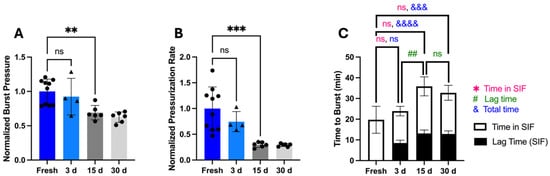 The effect of storage for up to 30 days at reduced humidity on bursting behavior of OSPRAE capsules in SIF. Non-covered OSPRAE capsules containing Tecoflex (NC/Teco) were tested in SIF after storage for 15 or 30 days. Capsules contained dried CA and SB, but no enteric covering. Capsule burst pressure (A), pressurization rate (B), and time to burst (C) were measured. Data were normalized to NC/Teco capsules in SIF. Data for 3 days is the same data in Figure 9A. Statistical significance is shown for comparisons of time to burst in SIF (*), lag time until pressure rise (#), and total time until burst (&). One-way ANOVA was used to determine significance (ns: p > 0.05, ## or ** p < 0.01, &&& or *** p < 0.001, &&&& p < 0.0001, n = 4–10 replicates per group).
