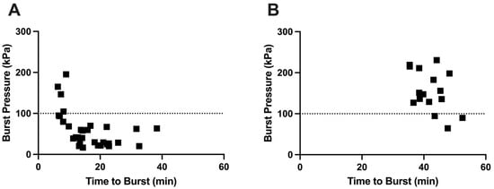 We hypothesized that the highest burst pressures are associated with a short time to burst, while a longer time to burst leads to lower burst pressure. This is because longer burst time is associated with a longer time for the gelatin in the delivery orifice to weaken (and therefore burst at a lower pressure) due to water absorption and enzymatic and thermal degradation [14]. Using capsules without an enteric covering, we observed this relationship, with short burst times associated with high burst pressures and longer burst times leading to lower burst pressure (Figure 11A). In contrast, there was little correlation between burst pressure and time to burst for enteric-covered capsules (Figure 11B), probably due to physical protection and mechanical reinforcement of the delivery orifice by the coating, enabling the delivery orifice to remain strong during long burst times.