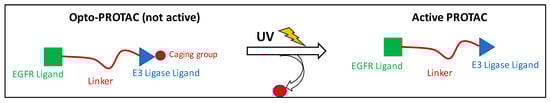 One of the most interesting approaches for latentiation is the design of photocleavable PROTACs, which are protected or “caged” with a photolabile group such as 4,5-dimethoxy-2-nitrobenzyl moiety (DMNB). In this approach, a light with a specific wavelength is used to activate and release the functional PROTACs from the caged ones (Figure 2) [36]. This technique allows the spatiotemporal control of proteolysis. These pharmacological tools should be cell-permeable, primarily inert as degraders, and stable intracellularly before light activation.