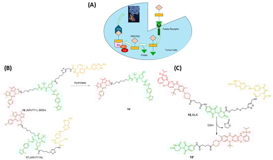 Researchers have identified the folate receptor (FOLR1) as a biomarker for tumor cells in ovarian, breast, and lung cancers [32,49]. This membrane protein is responsible for binding with folic acid and its reduced derivatives, which are accountable for the intercellular delivery of tetrahydrofolate. Other receptors, such as FOLR2 and FOLR3, can act as transporters of folate across cell membranes, despite having a lower affinity to folate than FOLR1 [48,50]. Therefore, FOLR1-targeting has long been used as an effective strategy for cancer imaging and selective targeting of tumors, and several FOLR1-targeting drugs are in phase II/III clinical trials [51]. Installing the folate onto the E3 ligase ligand via a linker allows the selective uptake of the PROTAC by the cancer cells, followed by cleavage of the linker by endogenous hydrolases, releasing the active drug (Figure 6A) [52,53,54]. With this knowledge, Jin and Wei at Harvard University developed a series of folate PROTAC molecules based on a VHL ligand to target BRD [54,55]. From these compounds, ARV-771 (16) showed the greatest potency against the POI. Interestingly, folate-ARV-771 degraded BRD4 as efficiently as ARV-771 in HeLa cells, while the non-cleavable negative control (17, folate-ARV-771N) produced no degradation. Continuing their work, they developed another series by installing the folate onto a CBRN ligand through a disulfide bond, which is glutathione sensitive, to target ALK kinase (18, Figure 6) [53,54,55]. This strategy provided a generalizable PROTAC platform for the selective degradation of proteins in cancer cells. Unfortunately, there is no in vivo data for folate-PROTACs to date, and their pharmacokinetic and pharmacodynamic properties are still unknown and not fully studied. Moreover, the use of these PROTACs is limited to the cells that are characterized by overexpression of the FOLR1 receptor [53].