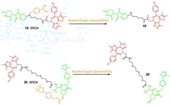 Scientists at ShanghaiTech University introduced a series of ROS-activated PROTACs that recruit CRBN E3 ligase for the selective degradation of BRD3. The prodrug contained an aryl boronic acid acting as a cage installed on the Lenalidomide ligand (19 in Figure 7) [56]. The aryl boronic acid cage transformed into a phenolic intermediate and underwent subsequent 1,6-benzyl exclusion to liberate the active PROTAC upon exposure to H2O2. Interestingly, this molecule selectively degrades BRD3 in tumor cells, whereas the parent PROTAC exhibits similar anti-proliferative activity in both cell types [56].