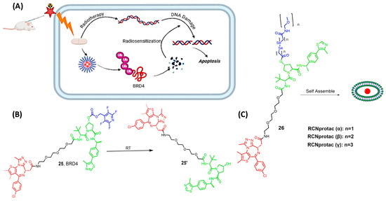 Xu et al. focused on developing an X-ray radiation-responsive PROTAC nanomicelle (RCNprotac) for tumor-specific proteolysis-enhanced radiotherapy. They aimed to integrate radiotherapy with protein degradation-mediated radiosensitization to prevent the repair of DNA and, thus, optimize anti-tumor therapy and avoid non-target toxicity [73]. MZ1 is one of the well-studied PROTACs with the ability to selectively degrade BRD4 over the other isoforms, BRD2 and BRD3 [74,75,76]. RCNprotac was synthesized by esterifying the hydroxyl group on the E3 ubiquitin ligand of MZ1 with a diselenide-bond-containing carbon chain and then conjugating PEG2000 to introduce hydrophilicity (26 Figure 9) [73]. The resulting amphiphilic RCNprotac precursor is self-assembled into nanomicelles. The conjugation of polyethylene glycol improves the solubility of the high molecular weight RCNportac, thus allowing ease in cell permeability and preventing the drawback of the high molecular weight [77]. The study results showed that the X-ray radiation-responsive PROTAC nanomicelles could effectively accumulate at the tumor site due to the enhanced permeability and retention effect. Upon exposure to X-ray radiation, the diselenide bonds in RCNprotac are broken, leading to the specific release of MZ1 for tumor BRD4 protein degradation. This degradation of BRD4 protein increased the tumor’s sensitivity to radiation, resulting in a synergistic enhancement of antitumor effects both in vitro and in vivo [73]. Moreover, the treatment with RCNprotac combined with X-ray radiation did not result in significant systemic side effects, indicating its potential as a safe and effective strategy for cancer therapy.