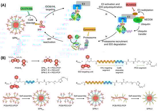 (A) Mechanism for CatB-specific activation of PROTAC-mediated IDO degradation; (B) The molecular structures and syntheses of SPNpro, SPN-1, and SPN-2. Figure adopted from Nature Communications, 2021, 12 (1): 2934 [78], under Creative Commons license.