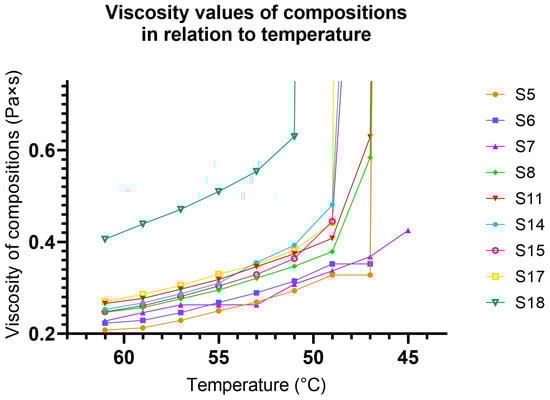 Compositions with less ideal traits were discarded when selecting candidates for further experiments. These critical traits were the average particle size (z average) and the polydispersity index (PDI). We aimed to create type IV self-nanoemulsifying systems; therefore, the upper limit of particle size was set to 32 nm, whereas the upper limit of PDI was 0.3. Thus, 9 out of 20 samples (S5–S8, S11, S14, S15, S17, and S18) were selected for further viscosity studies, where their respective melting/freezing points were determined.