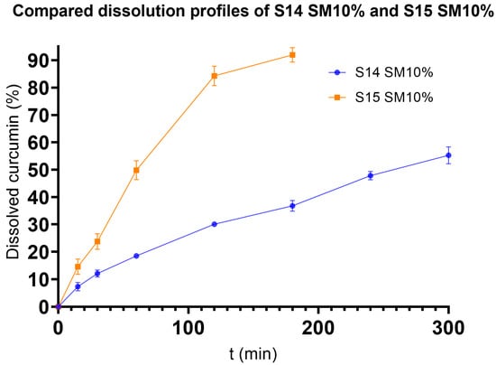 The results of the dissolution tests are shown in Figure 2. Based on the results of the droplet size analysis, the S14 SM10% and S15 SM10% formulations (S14 and S15 containing 10% SM) were subjected to dissolution tests in pH 1.2 hydrochloric acid media. Figure 2 shows the dissolution profiles of both formulations. When examining the release data of S15 SM10%, it is evident that the release of curcumin is too swift, taking only three hours to release nearly 92%.