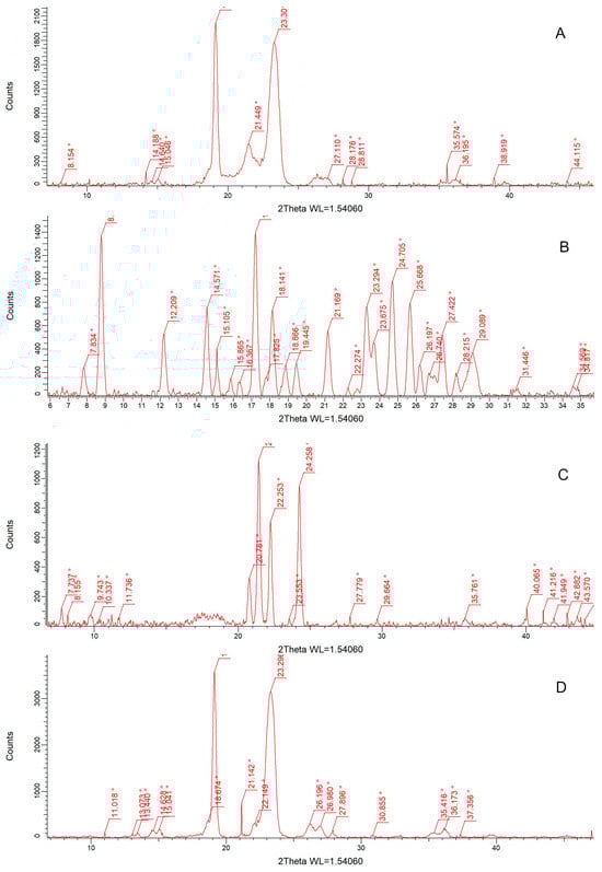 The diffractogram of CUR (Figure 3B) represents the crystalline nature of the API [52]. However, the characteristic peaks of it were not present in the formulation (Figure 3A), indicating that it was dissolved in the Gelucire–PEG matrix. When comparing diffractograms A with C and D, the main peaks of the composition were derived from PEG 6000 as the main excipient, with 2θ values of 23.3° and 19.2°, respectively, and from SM, with a 2θ value of 21.45°.