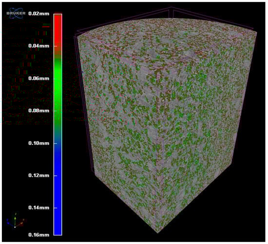 Looking at Figure 4, it can be said that the distribution of the air bubbles in the matrix is homogeneous. Inside the sample, we did not find any larger voids, indicating the uneven distribution of air or quick bubble coalescence during the molding process of the hot-foamed compositions. The scans also confirmed that a closed-cell structure was created. Negligible amounts of voids were found to be open to the environment, and the outer layer of our sample was smooth.