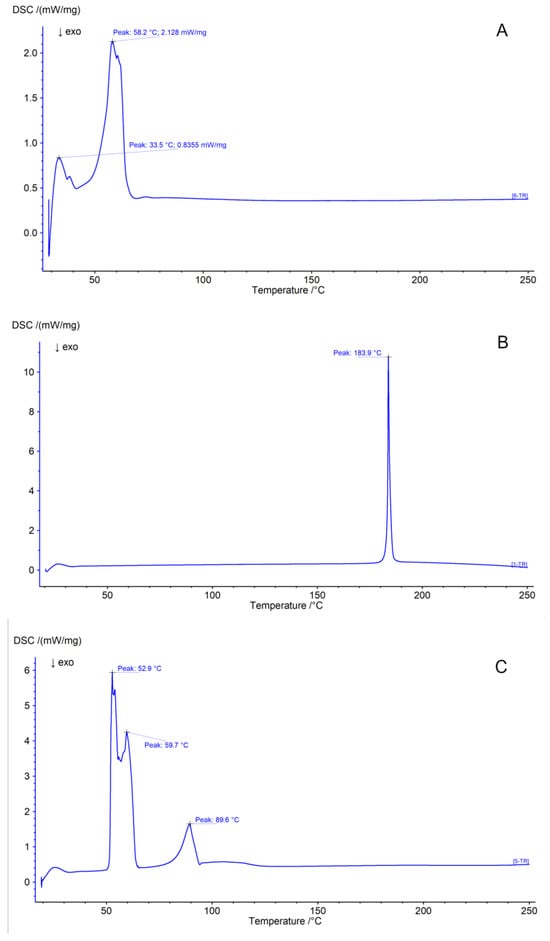 The results of the tests are shown in Figure 6. The acquired graphs were compared with the findings of various other researchers. Our high-purity crystalline CUR showed an endothermic peak at 183.9 °C, which can be associated with its melting [53]. The thermal transition of Gelucire 44/14 at 41.3 °C can be considered the melting of the excipient, which starts around 25 °C and ends at 51 °C [54]. Kolliphor RH40 was also tested; however, because the material is semi-solid or partially molten even at room temperature, the complete melting of the excipient was hardly recorded, as our DSC equipment could only start the measurements from ambient temperature. PEG 6000 presented a well-detectable melting with a peak at 62 °C [55], while stearylamine showed complex melting behavior with two peaks due to degradation by atmospheric CO2 [56].