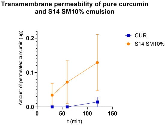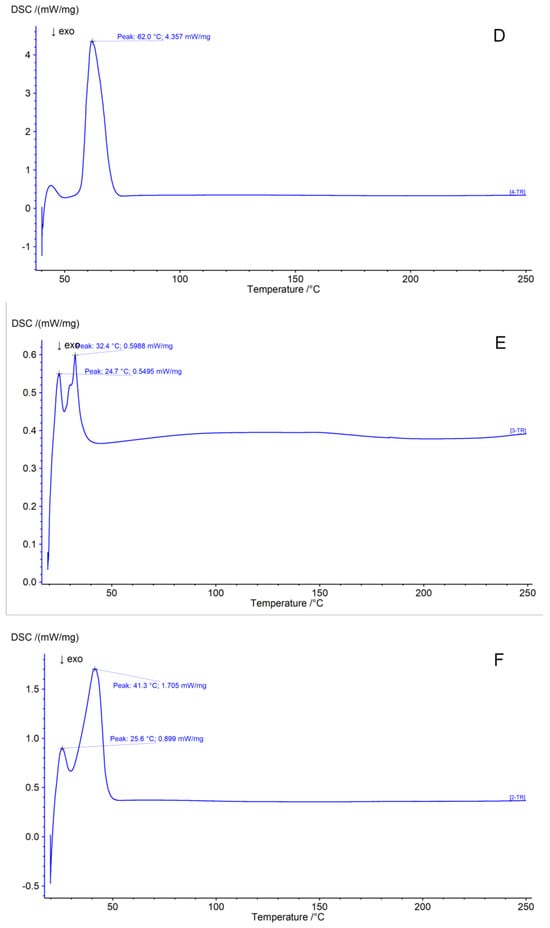 All the components, as well as the S14 SM10% formulation, were examined using differential scanning calorimetry (Figure 6A–F) to examine the changes in state or chemical structure (e.g., recrystallization, decomposition, oxidation, and loss of moisture). The main peak of curcumin at 183.9 °C cannot be detected in the calorimetric curve of the final formulation, indicating the dissolution or amorphous state of curcumin in the sample, which is in correlation with the literature results of similar compositions [72,73]. This was further verified by PXRD (Figure 3). This revealed a shift in the characteristic peak of curcumin. During API release, once emulsion droplets are formed, the release of the contained curcumin will be much quicker than that of crystalline-state curcumin due to the energy needed to hydrate the crystal lattices, and non-crystalline forms are able to circumvent solvation [74].