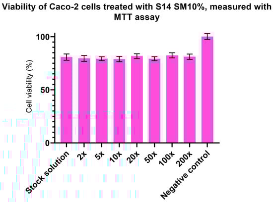 Viability of cells treated with S14 SM10% (compared to negative control) using the MTT staining method.