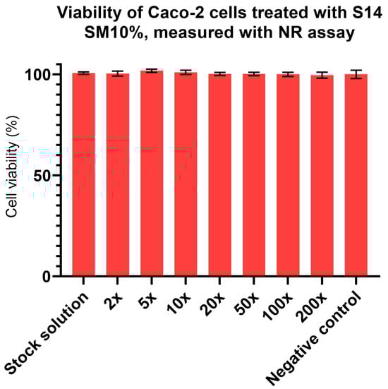 Viability of cells treated with S14 SM10% (compared to the negative control) using the NR staining method.
