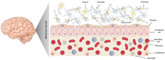 The BBB’s composition and function comprise brain endothelial cells sealed by tight junctions, supported by pericytes, astrocytic end-feet, and a basement membrane. This neurovascular unit provides selective permeability, maintaining CNS homeostasis []. Human brain capillaries extend extensively (~20 m2 of surface area), ensuring the proximity of neurons to the blood supply. BBB endothelial cells lack fenestrations and exhibit minimal vesicular transport, restricting transport pathways [,,].