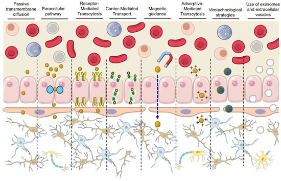 Tight junctions between endothelial cells, composed primarily of claudin-5, occludin, and junctional adhesion molecules linked to actin via ZO-1, create the primary physical barrier. These junctions minimize the paracellular space, allowing only tiny hydrophilic molecules (<1.8 nm diameter) to enter, with negligible entry [,]. Claudin-5 deletion demonstrates selective permeability to molecules < 800 Da, reinforcing the tight junctions’ role in size-dependent exclusion [,,]. Consequently, more than 98% of small-molecule drugs fail to cross the intact blood–brain barrier (BBB) passively [,,]. The integrity of tight junctions can be disrupted by inflammation or hypoxia, transiently increasing permeability, whereas the tightening of tight junctions correlates with BBB maturation []. Conversely, in development, the tightening of tight junctions (especially claudin-5 enrichment) correlates with the maturation of BBB function [,]. Overall, the tight junctions network endows the BBB with a restrictive paracellular gate that, in healthy states, admits virtually no polar molecules larger than a few hundred daltons.