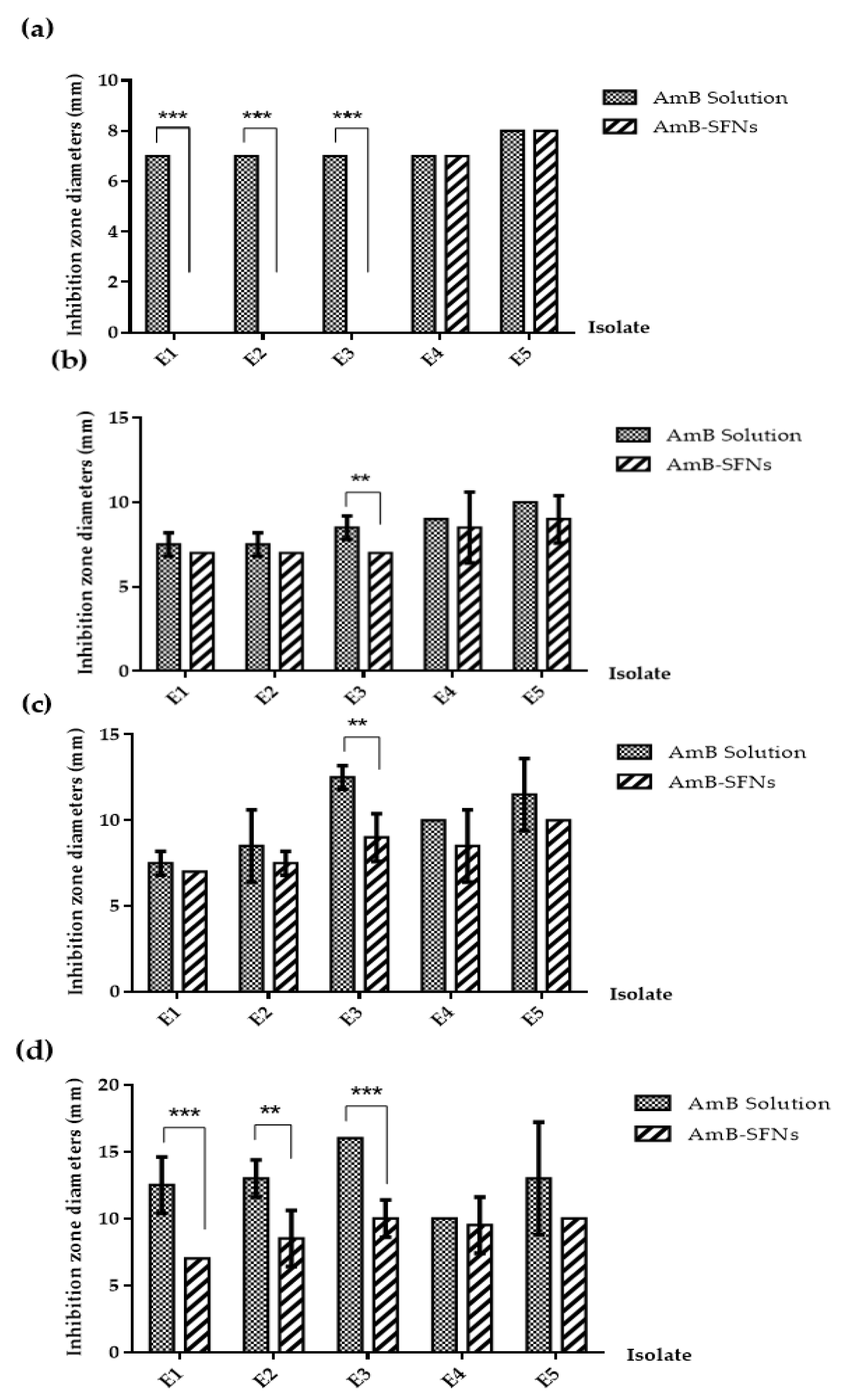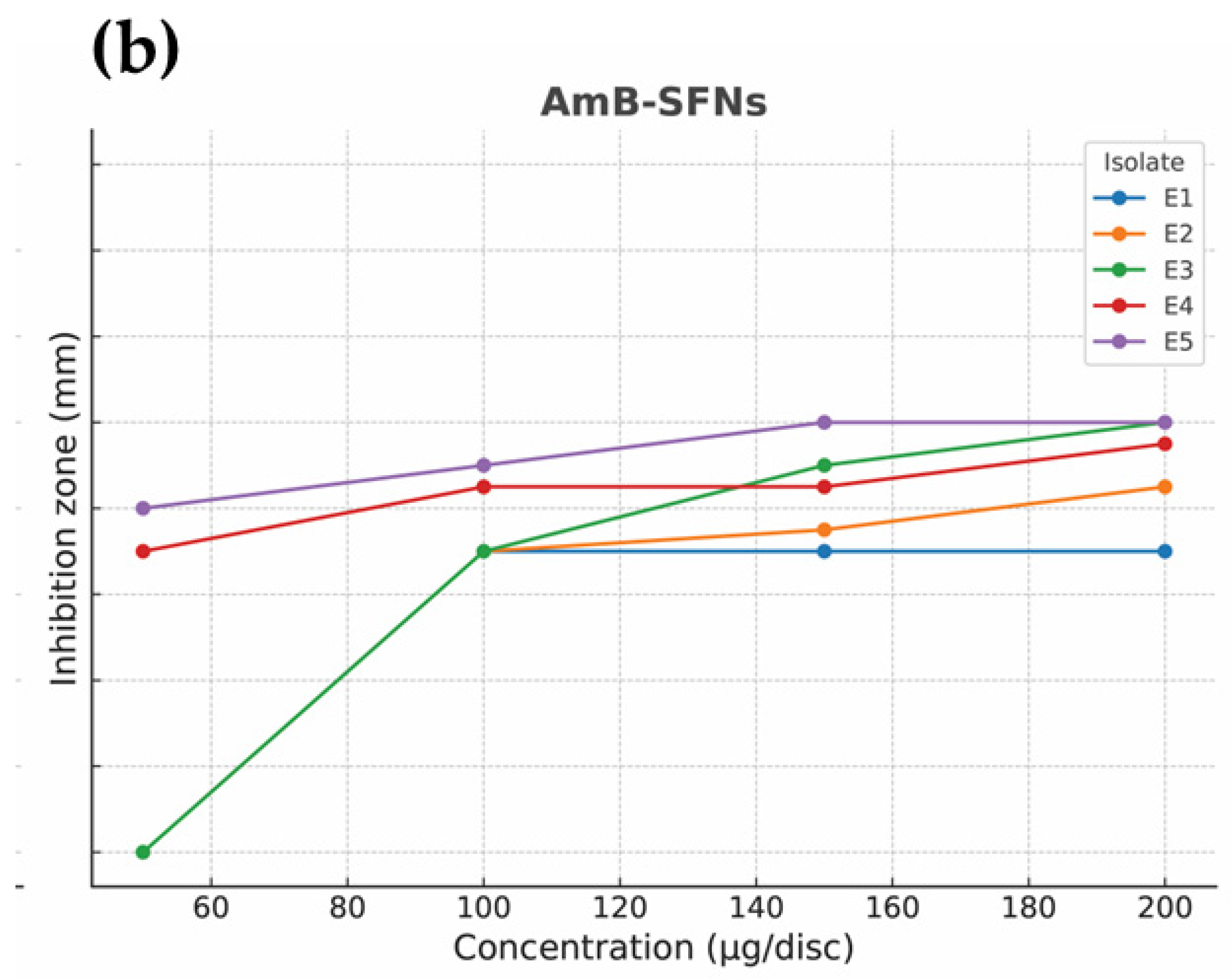 Isolate | Concentration (µg) | AmB Solution (mm) | AmB-SFNs (mm) |