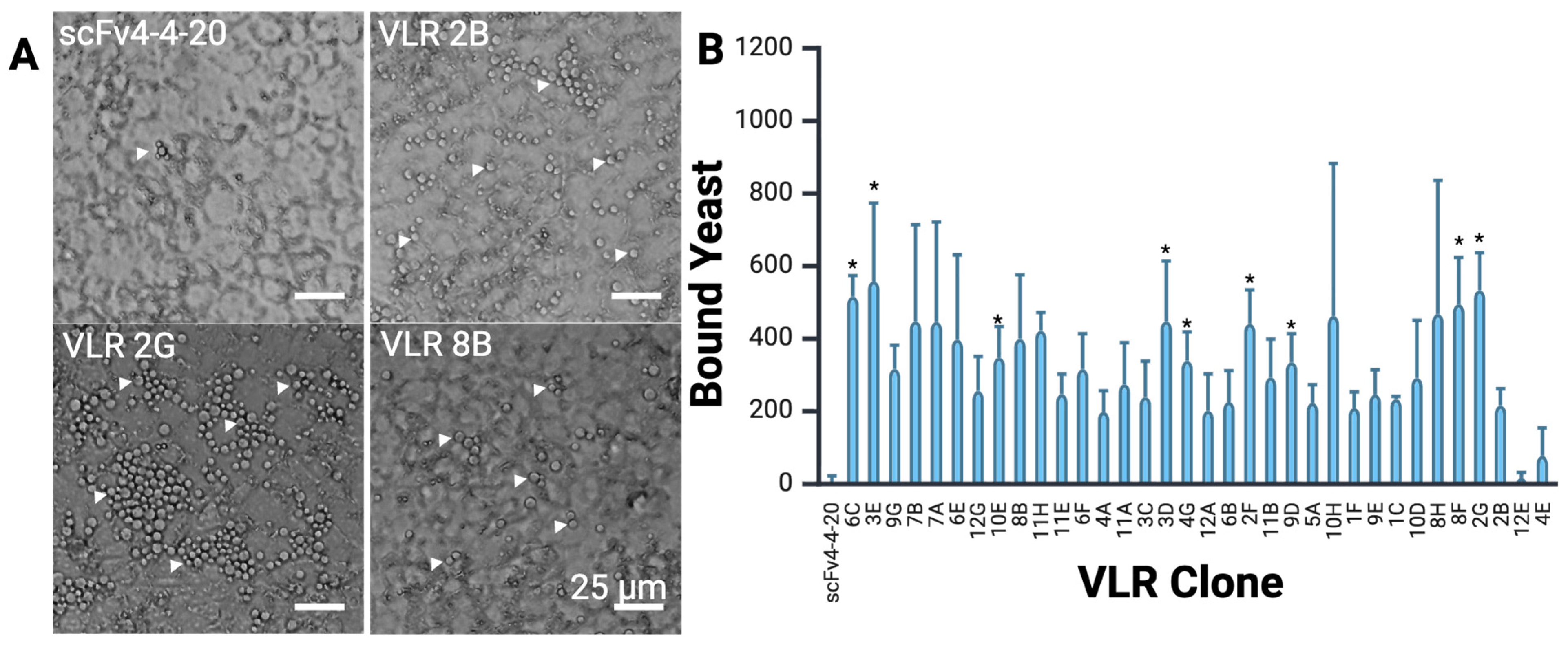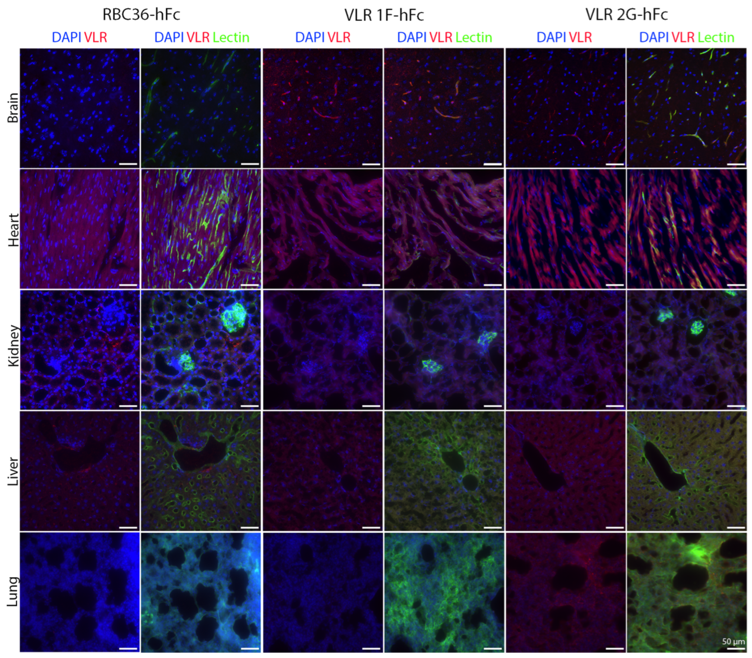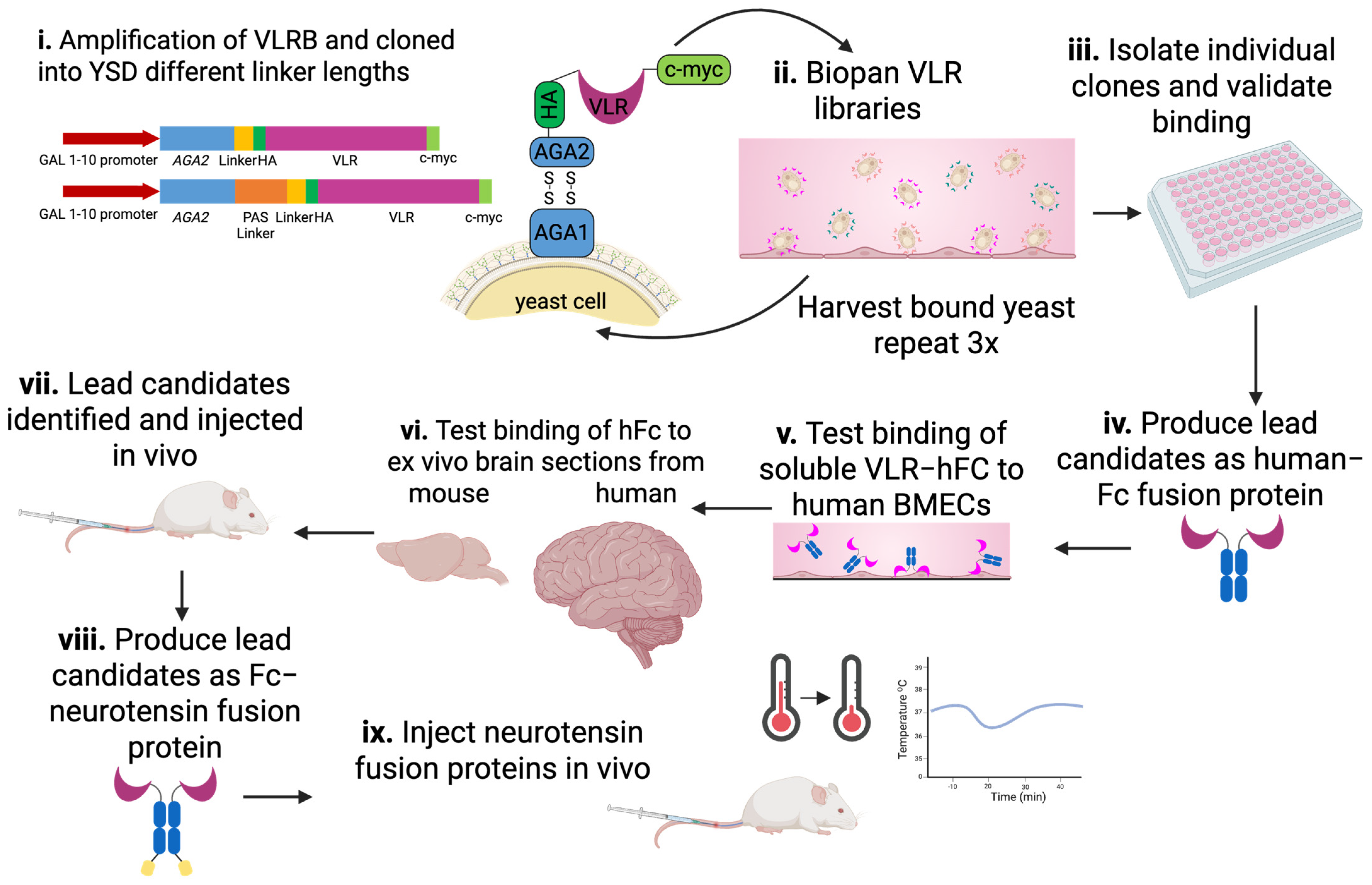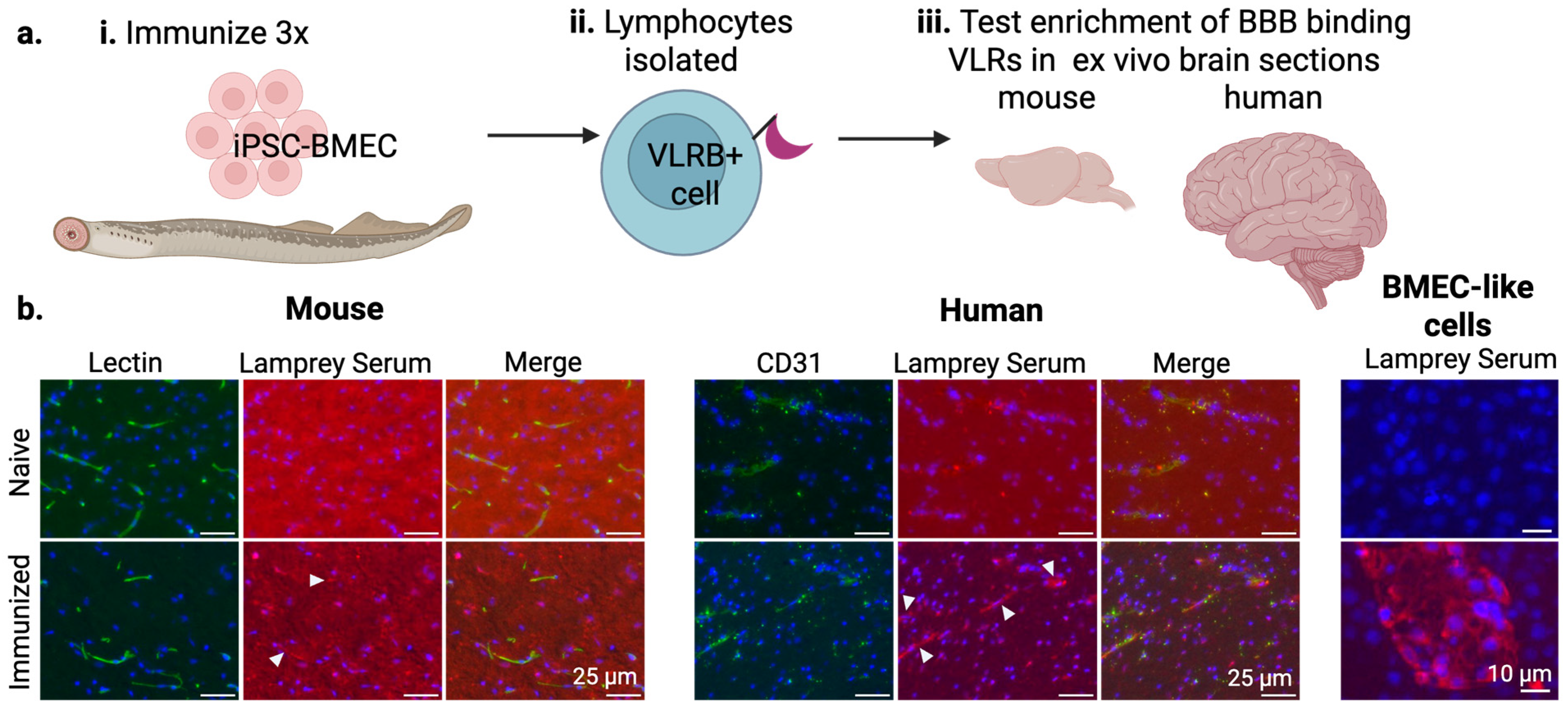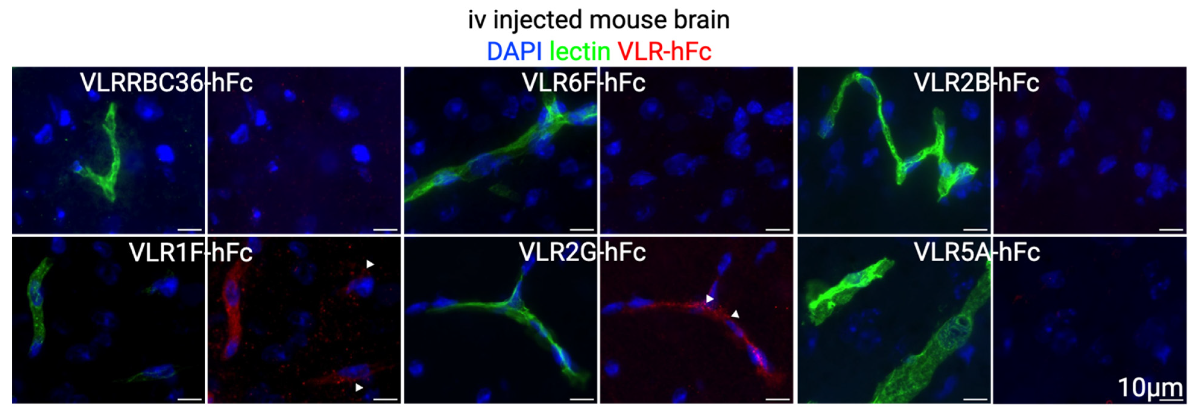 - Lajoie, J.M.; Katt, M.E.; Waters, E.A.; Herrin, B.R.; Shusta, E.V. Identification of Lamprey Variable Lymphocyte Receptors That Target the Brain Vasculature. Sci. Rep. 2022, 12, 6044. [Google Scholar] [CrossRef] [PubMed]