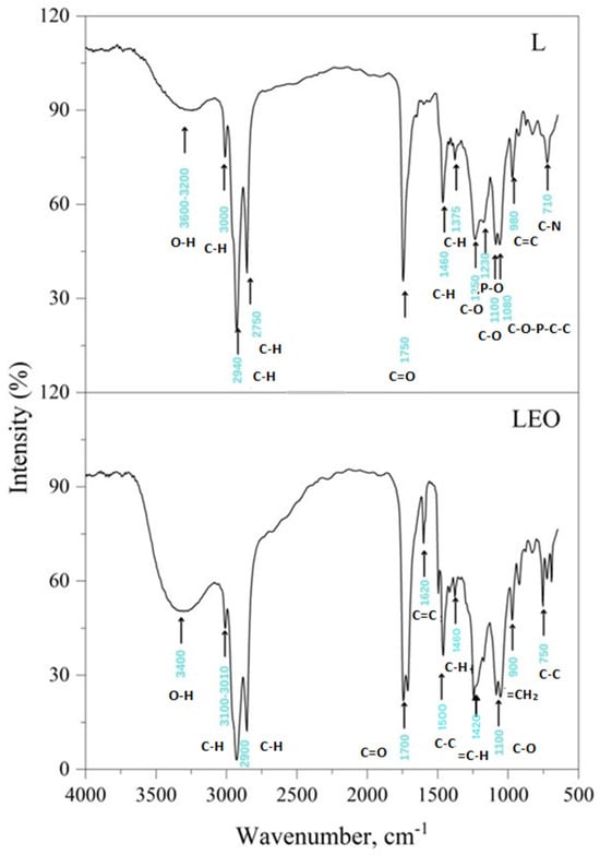 FTIR spectra were measured directly on the applied samples (L and LEO) using an Agilent Technologies Cary 630 FTIR. The FTIR spectral range mode was from 400 to 4000 cm−1, with a resolution of 4 cm−1.