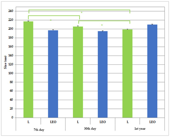 Size of prepared liposomes during 1st year of storage. * A statistically significant difference related to the values of size (between 7th day and 30th day of storage for L; between 30th day and 1st year of storage for L; and between 7th day and 1st year of storage for L).