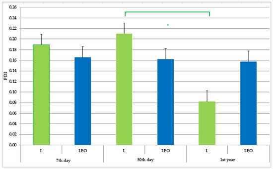 The polydispersity index (PDI) indicates the distribution and uniformity of particle sizes in a system. A low PDI value typically reflects a high level of uniformity among nanoparticles [47]. It is generally accepted that a PDI value of 0.1 to 0.25 indicates a narrow size distribution, whereas a PDI greater than 0.5 suggests a broad distribution of particle size [48]. In all tested samples, the PDI values consistently remained below 0.2, indicating that the liposomes were relatively monodisperse [49]. The mean value of PDI of empty liposomes did not significantly change after 30 days of storage, while it significantly decreased after 1st year in comparison to the result obtained on the 30th day of investigation (sample L). Taking into account the previously discussed reduction in liposome size in sample L, it could be assumed that the observed trend of size decrease was more pronounced between the 30th day and 1st year of the investigation, bearing in mind that there was no significant change in PDI within the first 30 days of storage. Similar tendencies in size and PDI changes during liposome storage were reported by Pinilla et al. [50]. On the other hand, size and PDI measurements of liposomes encapsulating EO (sample LEO) revealed no changes in the stated parameters throughout the same test period (Figure 3 and Figure 4).