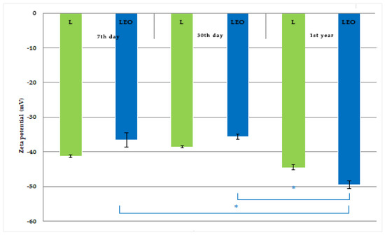 Zeta potential of prepared liposomes during 1st year of storage. * A statistically significant difference related to the values of zeta potential (between 7th day and 1st year of storage for LEO; between 30th day and 1st year of storage for LEO).