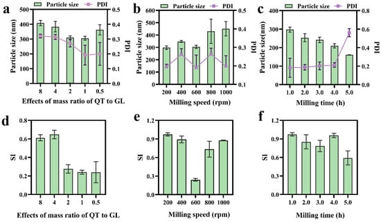 The effects of (a,d) the mass ratio of QT to GL, (b,e) milling speed, and (c,f) milling time on the particle size, PDI, and SI of QT-NCs, n = 3.